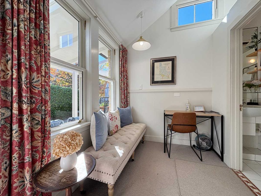 Outside, there is a covered balcony with a table and chairs to relax with a coffee or a glass of wine while looking out over the cottage garden. There is also access to the Lodge’s shared outdoor fire and seating area.